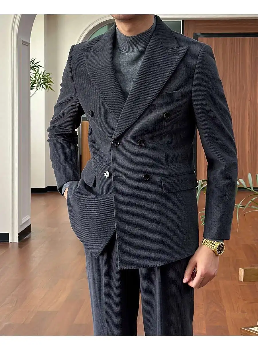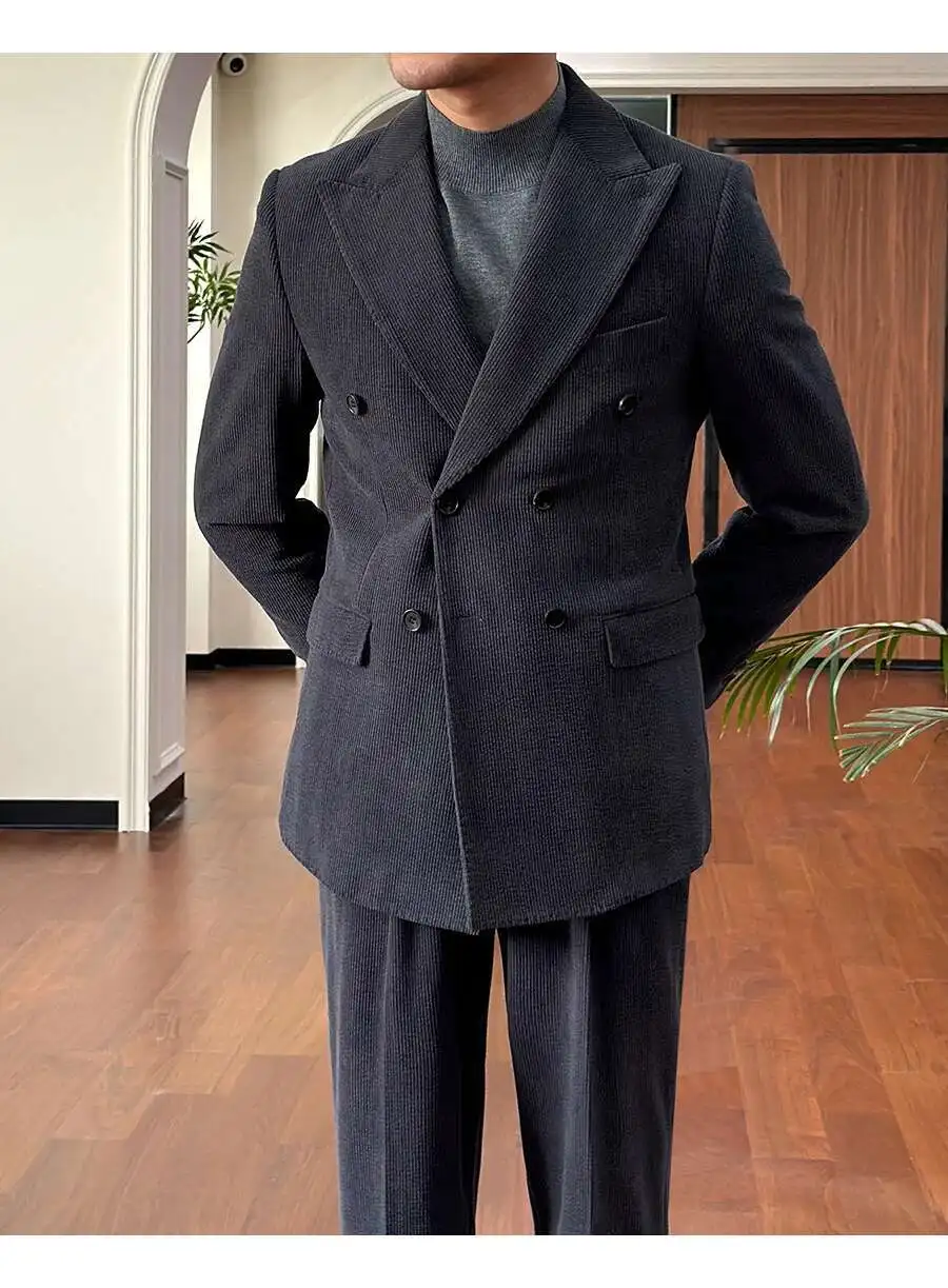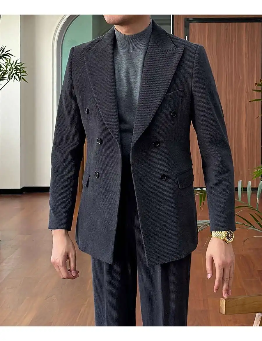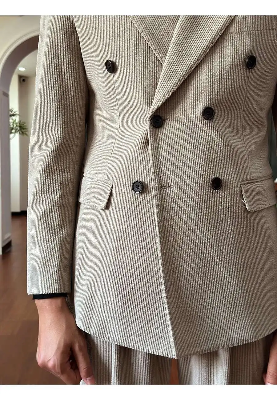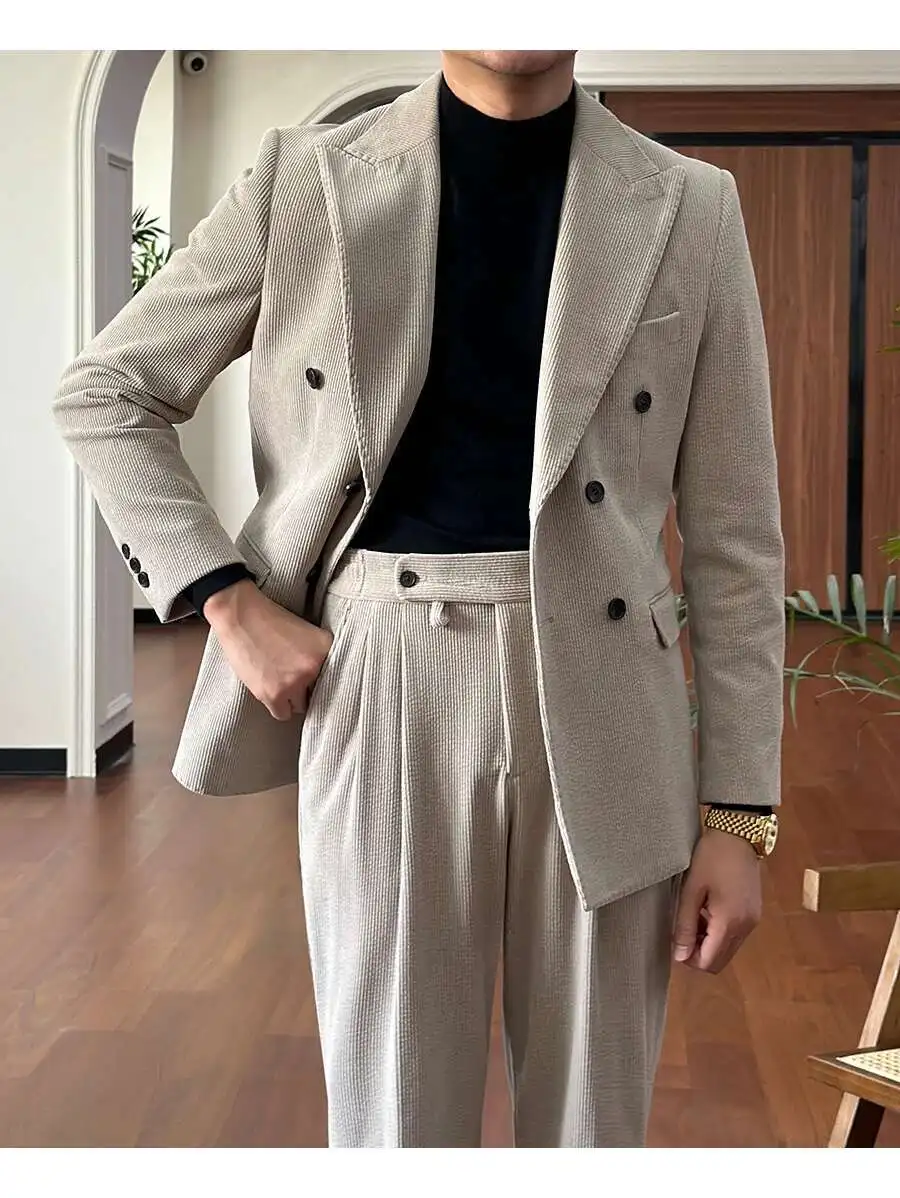 2024 Autumn Thick Corduroy Groom Men Suit Designers Slim Fit Business Casual Double Breasted Suit Set Trend Traje Novio 2024