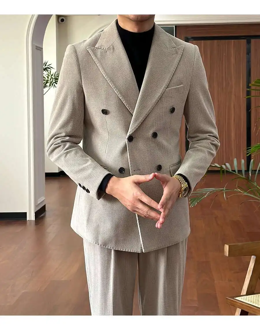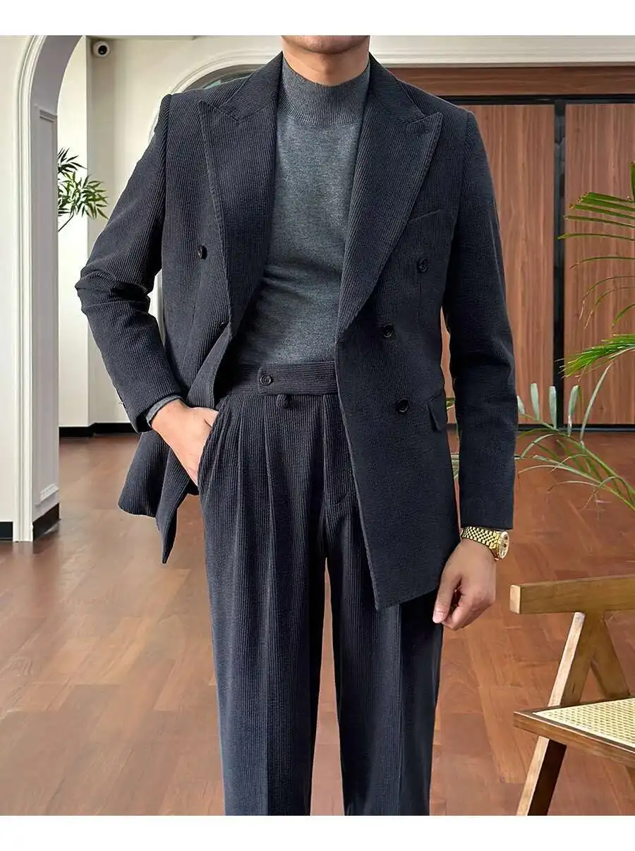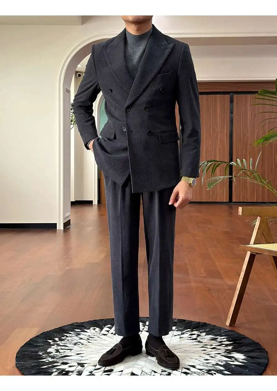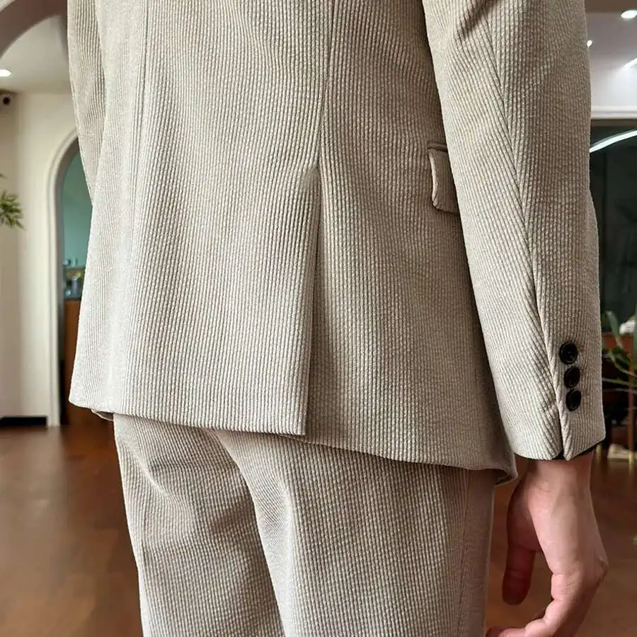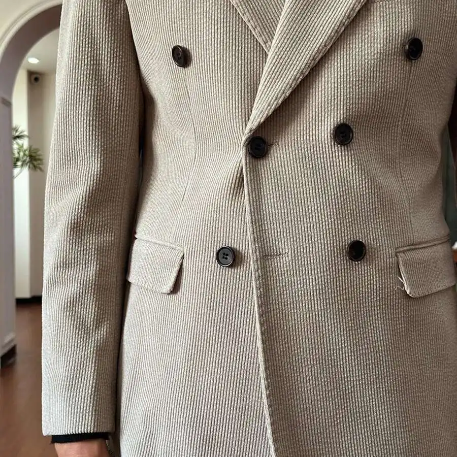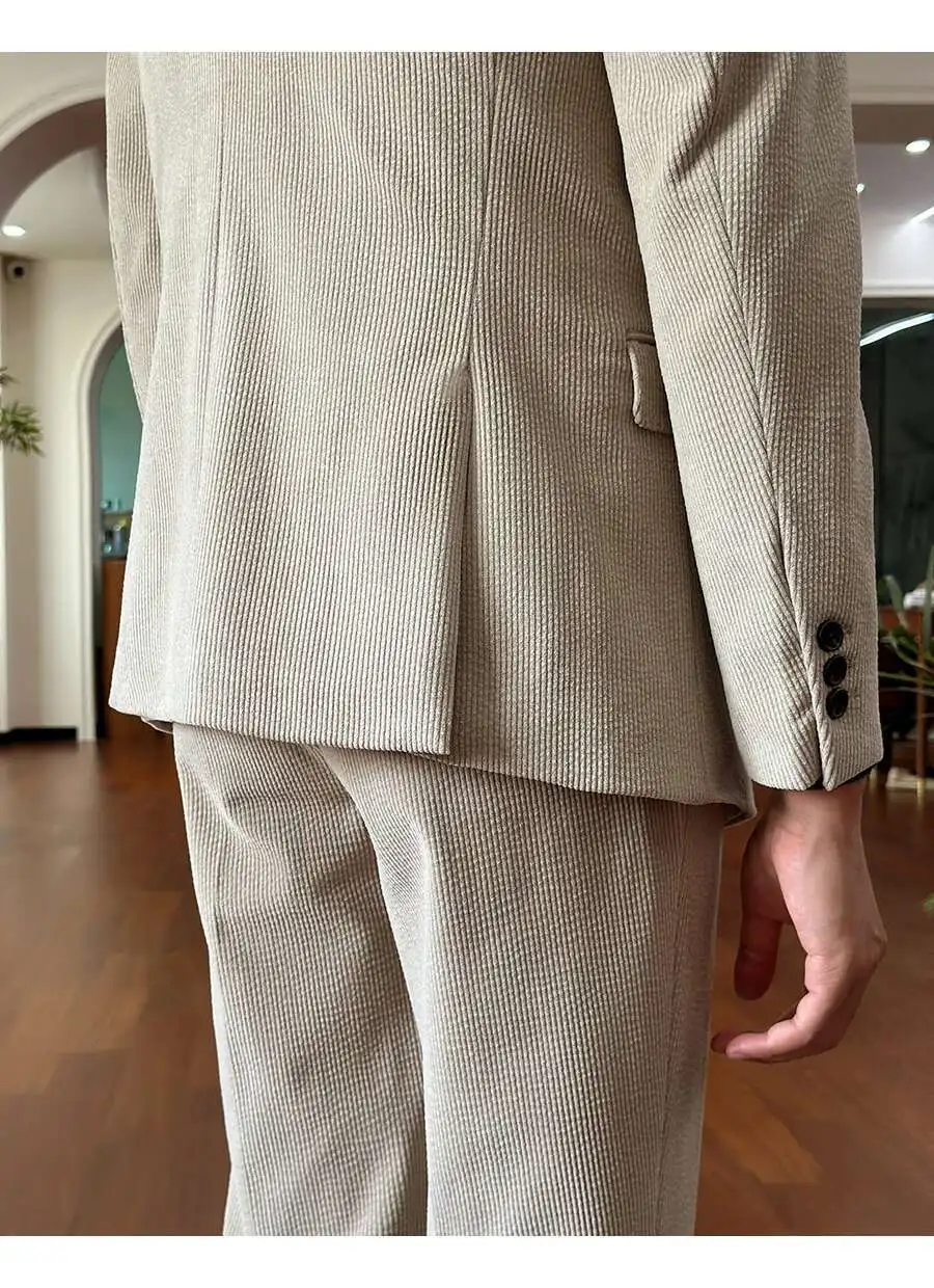 2024 Autumn Thick Corduroy Groom Men Suit Designers Slim Fit Business Casual Double Breasted Suit Set Trend Traje Novio 2024