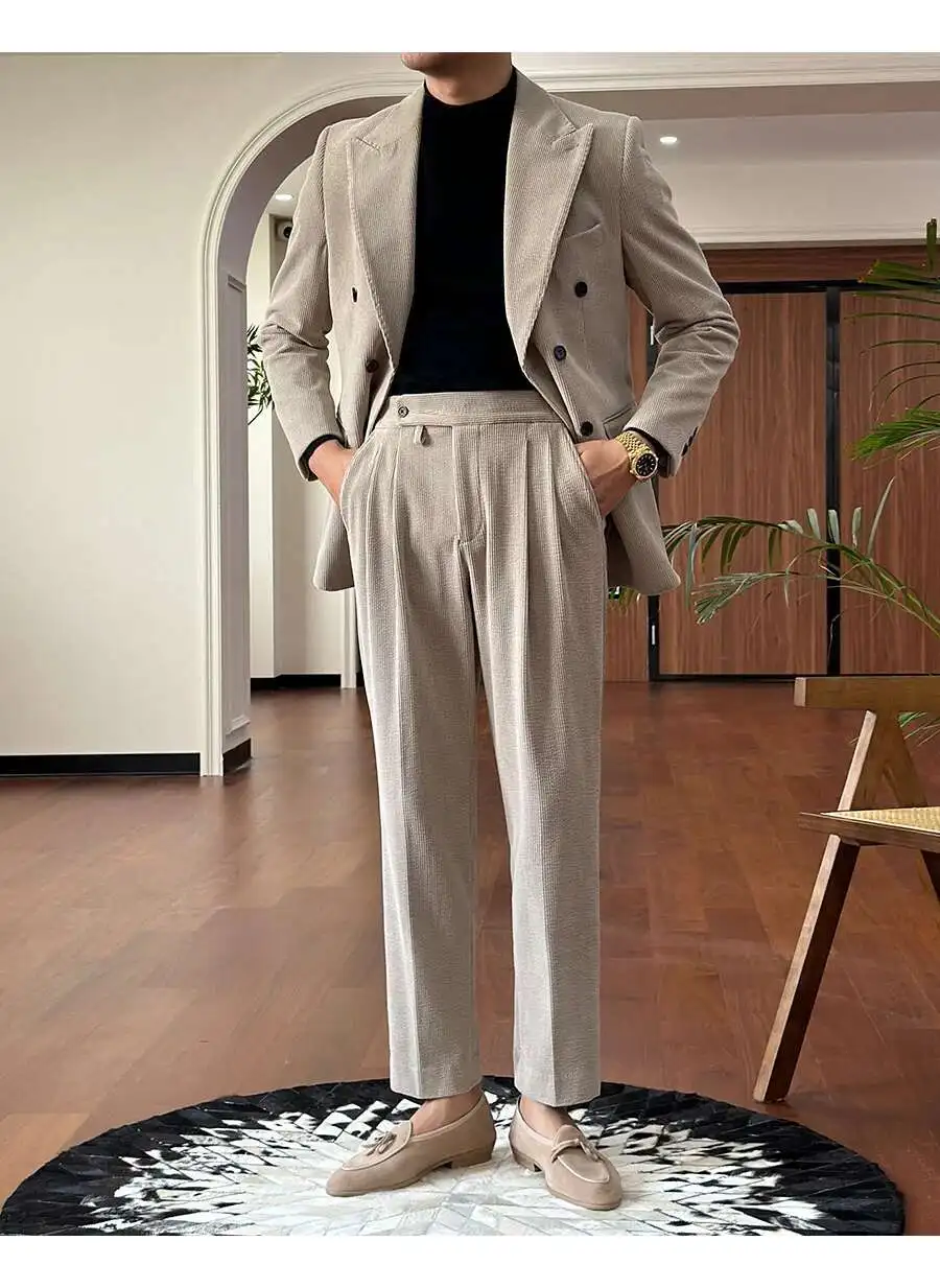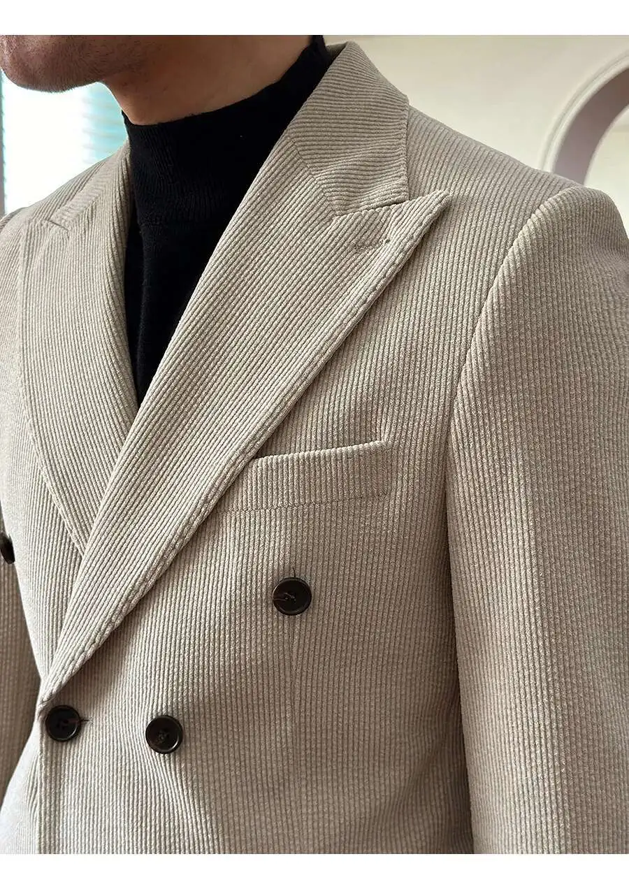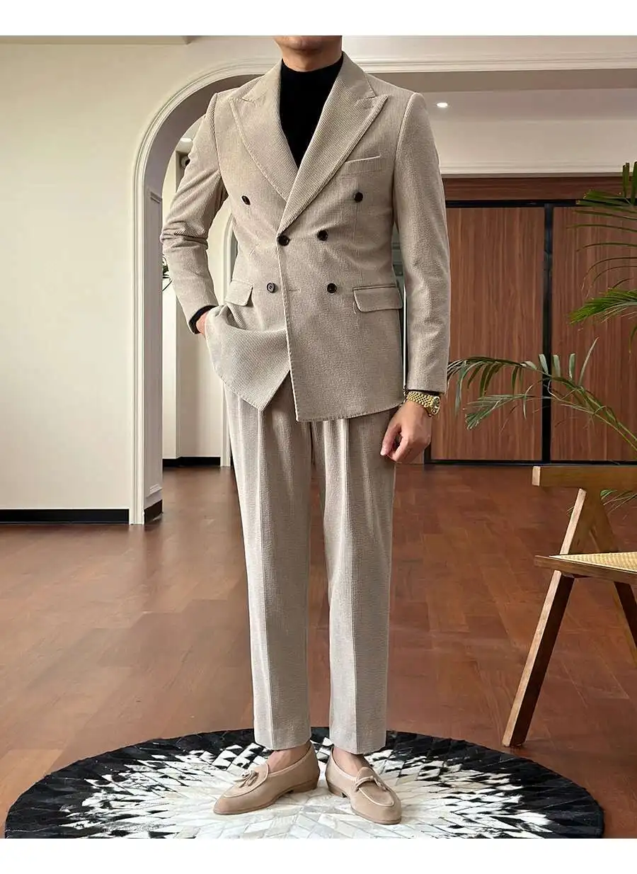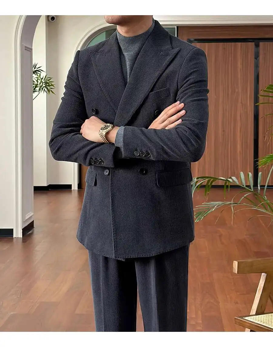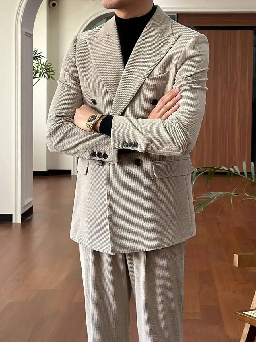 2024 Autumn Thick Corduroy Groom Men Suit Designers Slim Fit Business Casual Double Breasted Suit Set Trend Traje Novio 2024